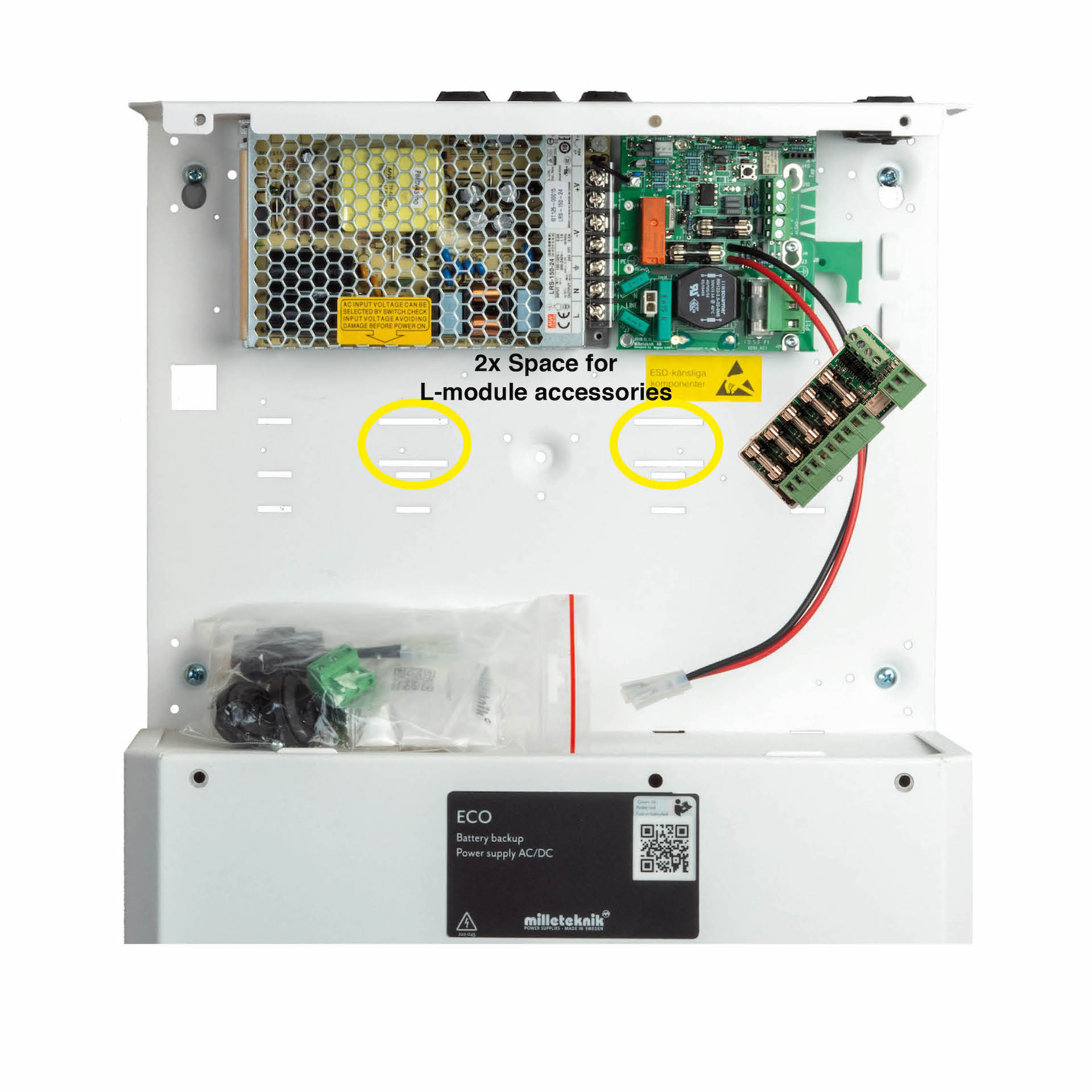 The ECO series consists of reliable and compact power supplies for use with access control systems, locking systems and smoke hacks. The battery backups of the ECO series have a built-in charge control that effectively prevents overcharging and thereby significantly extends the life of the batteries.