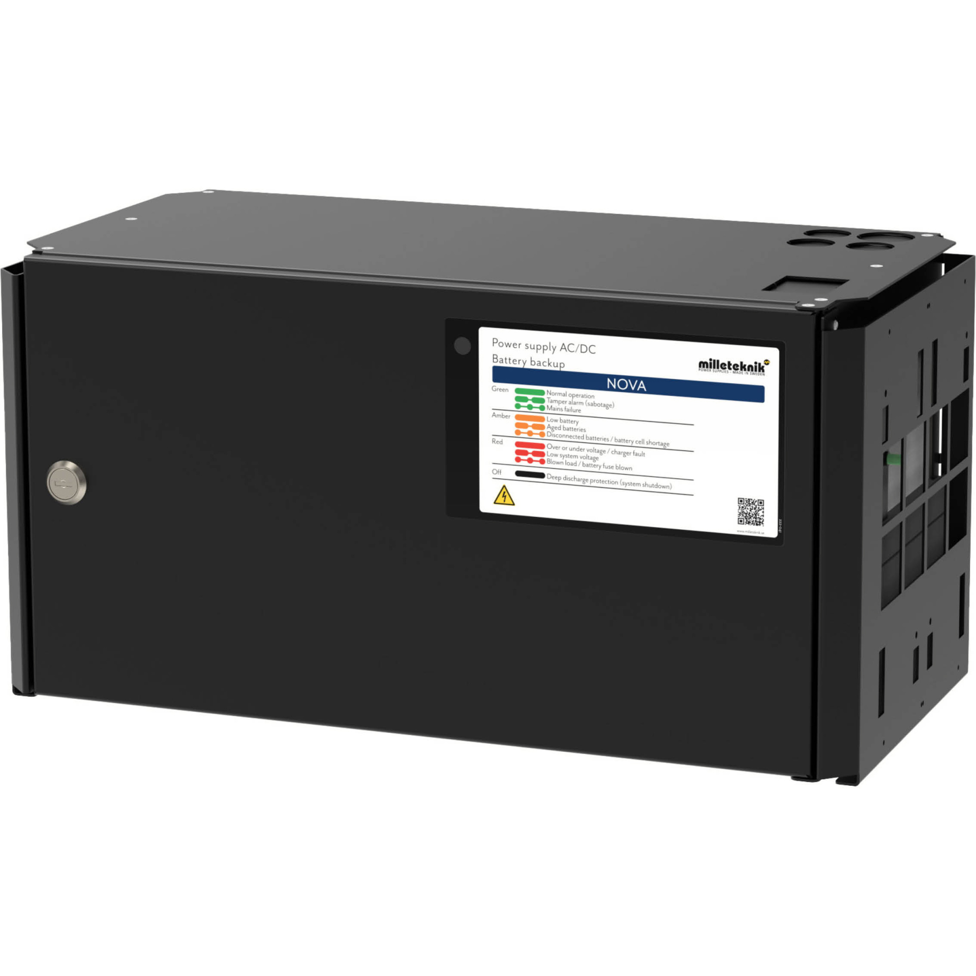 Nova series battery backup has high flexibility, advanced alarm features, long spare operating times, can handle high loads and has communication. NOVA battery packs have advanced controlled charging* that prevents batteries from being overcharged and significantly prolongs their life. The battery backup reads the attached load and recharges the batteries with the remaining power from the power supply. NOVA Battery Backups also perform battery tests to notify when batteries need to be replaced. To maintain certificates, UPLUS 10+ Design Life AGM batteries shall be used. NOVA has intelligent charging which means that when the batteries are fully charged, they will be put in electronically for standby mode for up to 20 days or when the battery voltage has reached 13.4 V / 26.7 V. By discharging the batteries controlled and recharging them cyclically (instead of not using them), the life of the batteries is extended by up to 50%. The batteries automatically connect in less than 50 microseconds, if needed. NOVA as 12 V is not certified. Mounting: NOVA can be mounted on wall or in 19″ racks, reversible brackets included. Installation and Deployment: Fixed Installation. Battery types: UPLUS 10+ Design Life AGM batteries. Battery boxes (sold separately): It is not possible to extend NOVA 12 V with more battery boxes. Typical uses: