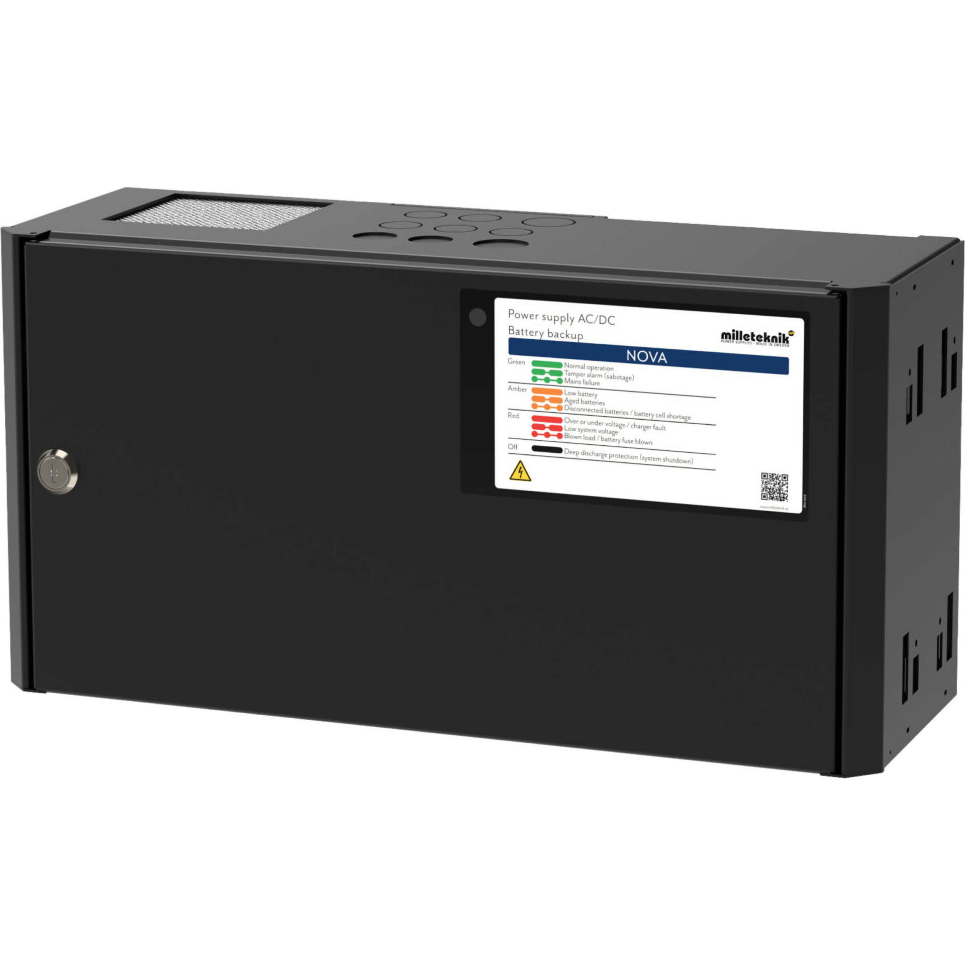 Nova series battery backup has high flexibility, advanced alarm features, long spare operating times, can handle high loads and has communication. NOVA battery packs have advanced controlled charging* that prevents batteries from being overcharged and significantly prolongs their life. The battery backup reads the attached load and recharges the batteries with the remaining power from the power supply. NOVA Battery Backups also perform battery tests to notify when batteries need to be replaced. To maintain certificates, UPLUS 10+ Design Life AGM batteries shall be used. NOVA has intelligent charging which means that when the batteries are fully charged, they will be put in electronically for standby mode for up to 20 days or when the battery voltage has reached 13.4 V / 26.7 V. By discharging the batteries controlled and recharging them cyclically (instead of not using them), the life of the batteries is extended by up to 50%. The batteries automatically connect in less than 50 microseconds, if needed. NOVA as 12 V is not certified. Mounting: NOVA can be mounted on wall or in 19″ racks, reversible brackets included. Installation and Deployment: Fixed Installation. Battery types: UPLUS 10+ Design Life AGM batteries. Battery boxes (sold separately): It is not possible to extend NOVA 12 V with more battery boxes. Typical uses: