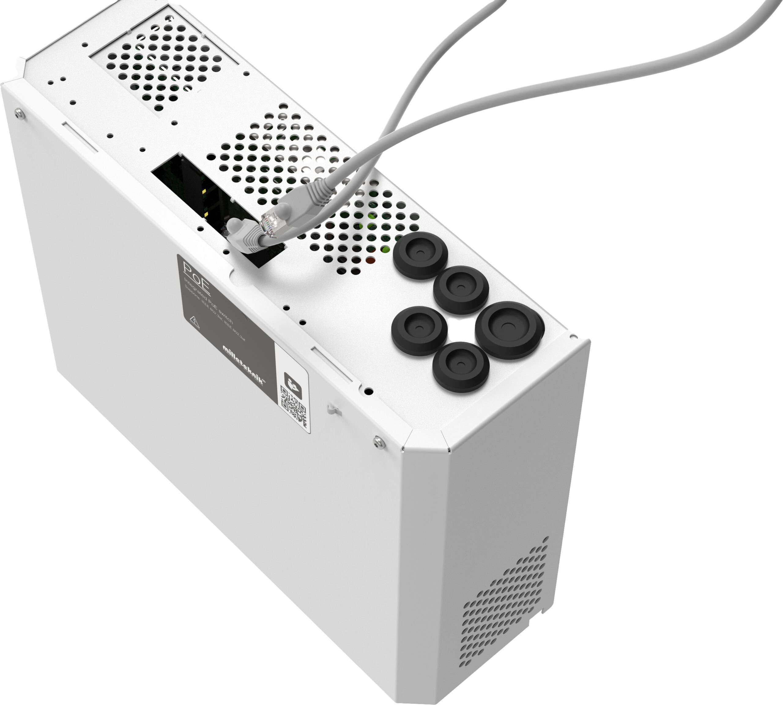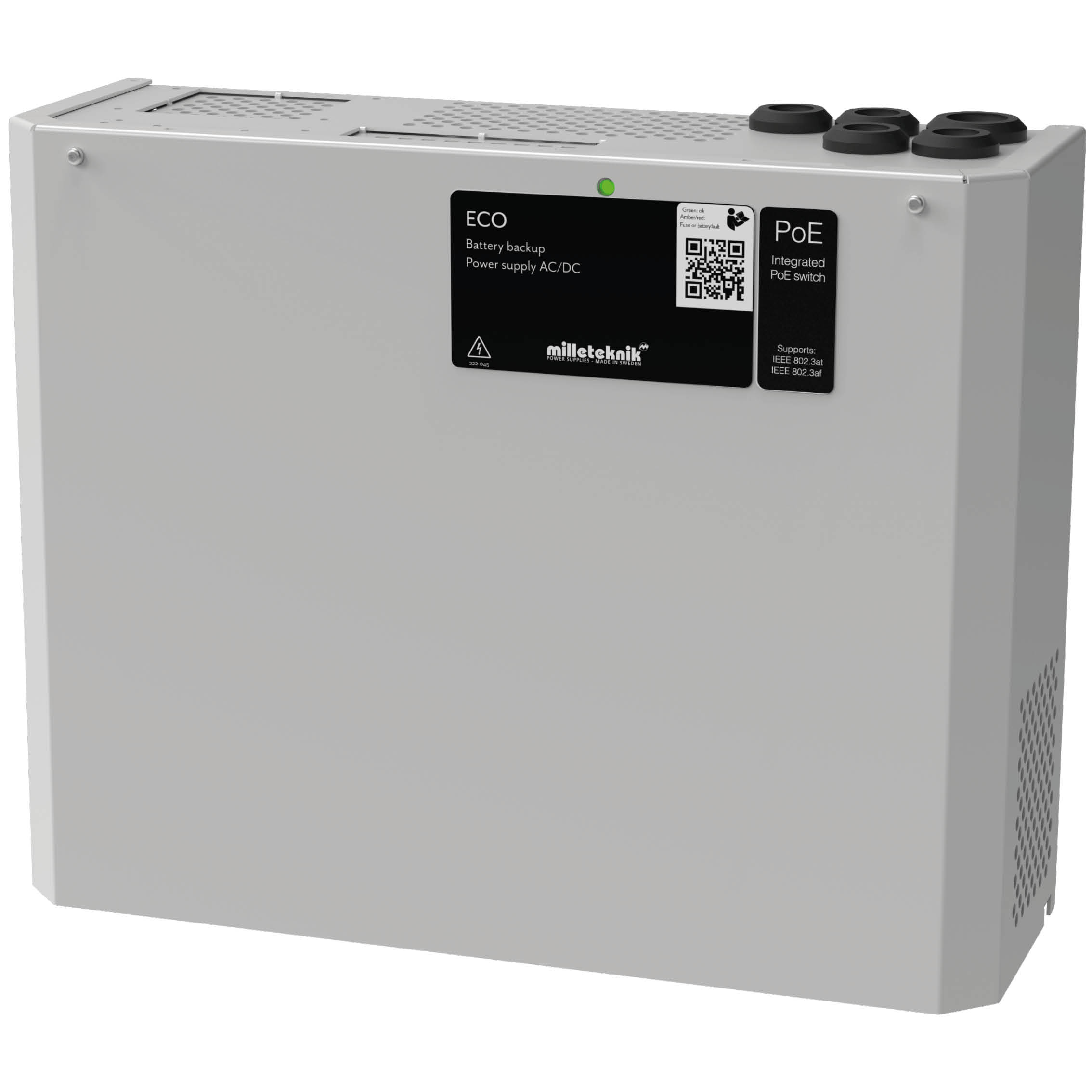 PoE switch 4p M is mainly used in security systems where a simple and reliable power supply with battery backup & PoE function is needed. The device has a controlled charge which means that the batteries are never charged by more than 0.5A. This prevents the batteries from being overcharged and significantly prolongs their life. The device has a PoE switch with two LAN and four PoE ports. Alarm for (1 output): Delayed network termination alarm (52.8V) or low battery voltage (48V). 1 single-pole (+) unsecured output (glass fuse) for feeding the PoE switch. Maximum power per port: 30.8 W (22 W@41 VDC/in deep discharge batteries). PoE Budget: 125 W. Support for: PoE standard IEEE 802.3af/15.4 W per port & IEEE 802.3at/30.8 W per port. Protection for: overload, overvoltage, overtemperature, short circuit and deep discharge. Mounting: Wall. Installation: Fixed installation. Battery types: AGM batteries.
