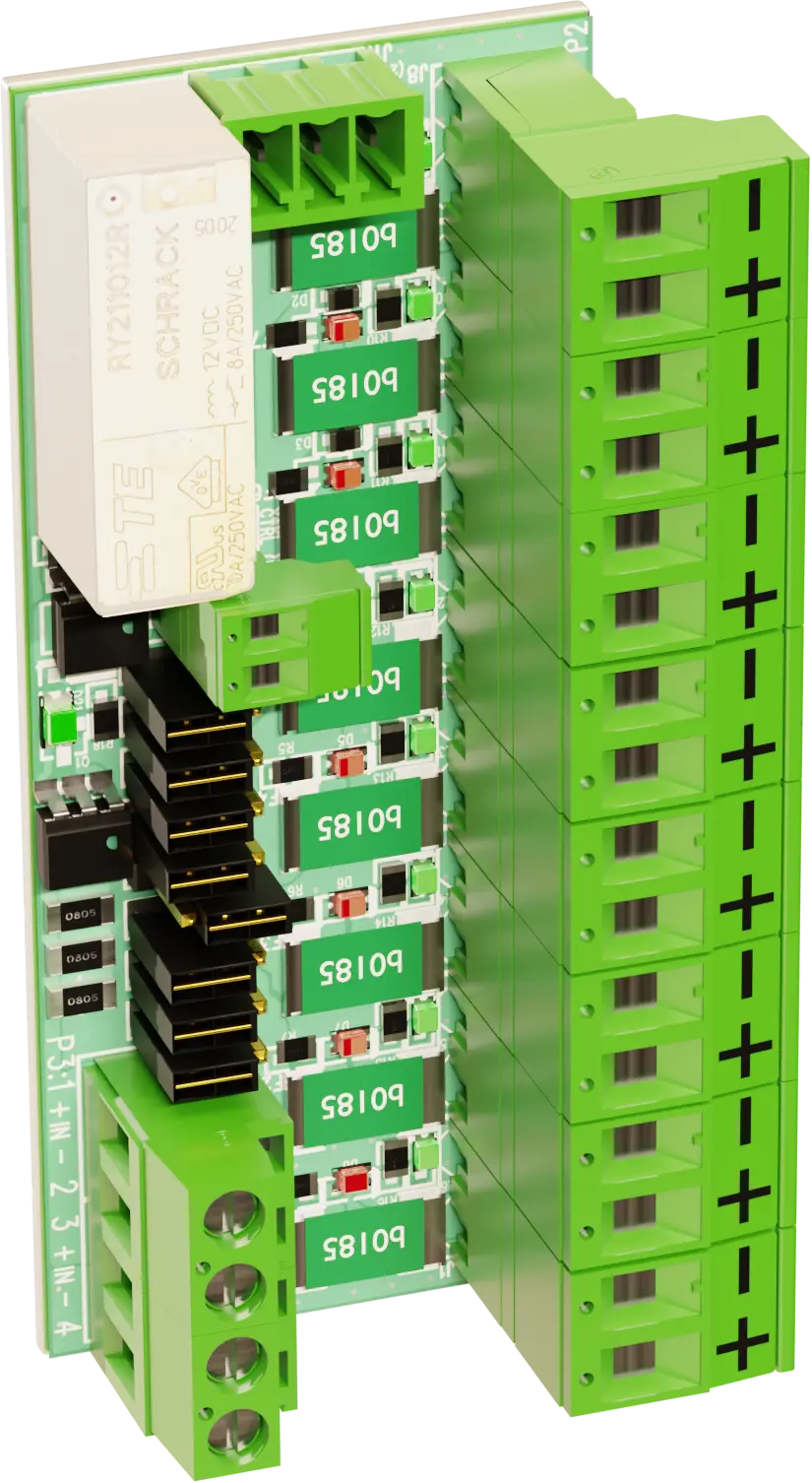 Avsäkringskort med åtta 1-poligt avsäkrade utgångar. Kortet skyddar elektronik med PTC-säkringar som automatiskt bryter strömmen vid överbelastning. Säkringarna återställs sedan automatiskt när överbelastningen försvinner. Kortet kan användas med både 12 V DC och 24 V DC. Varje utgång är styrbar via bygel.