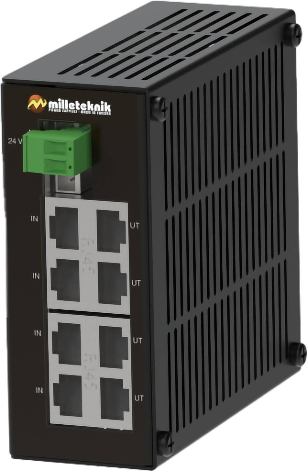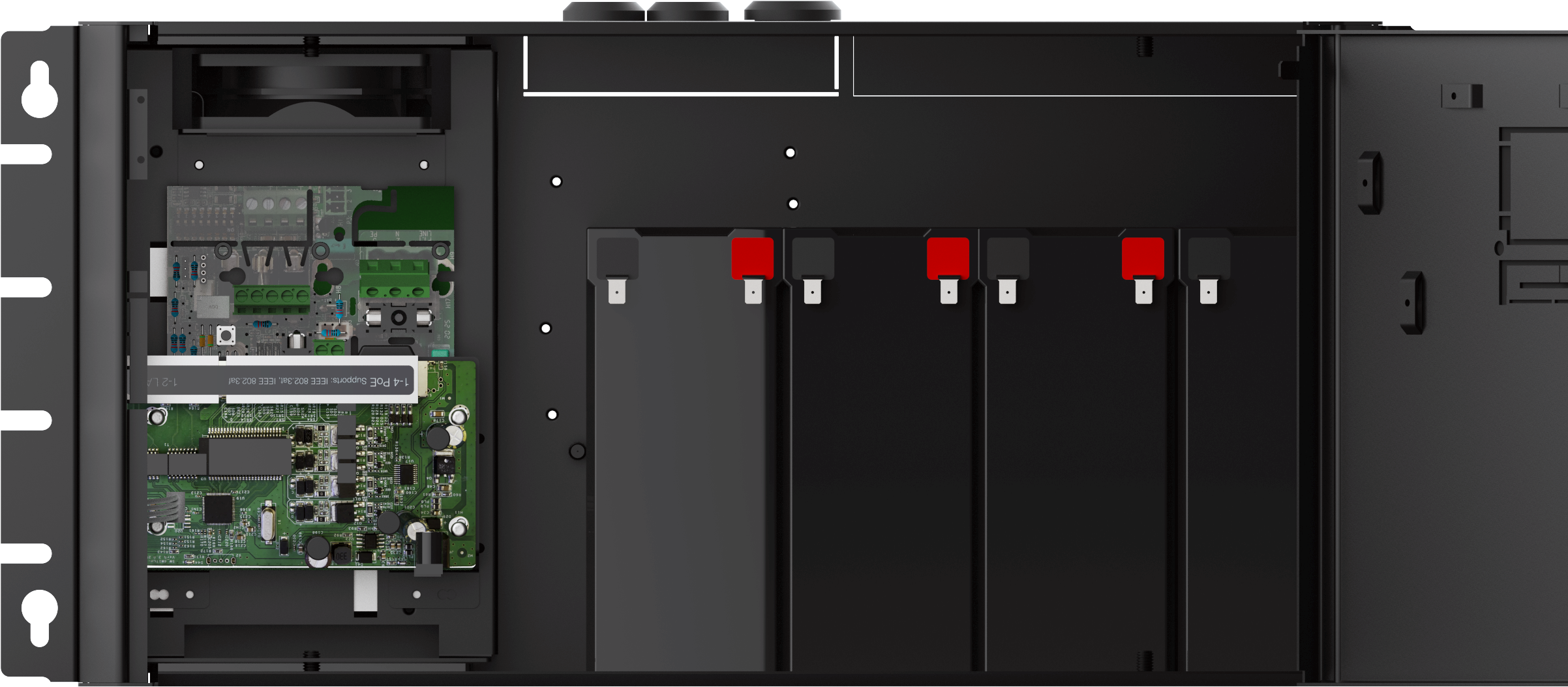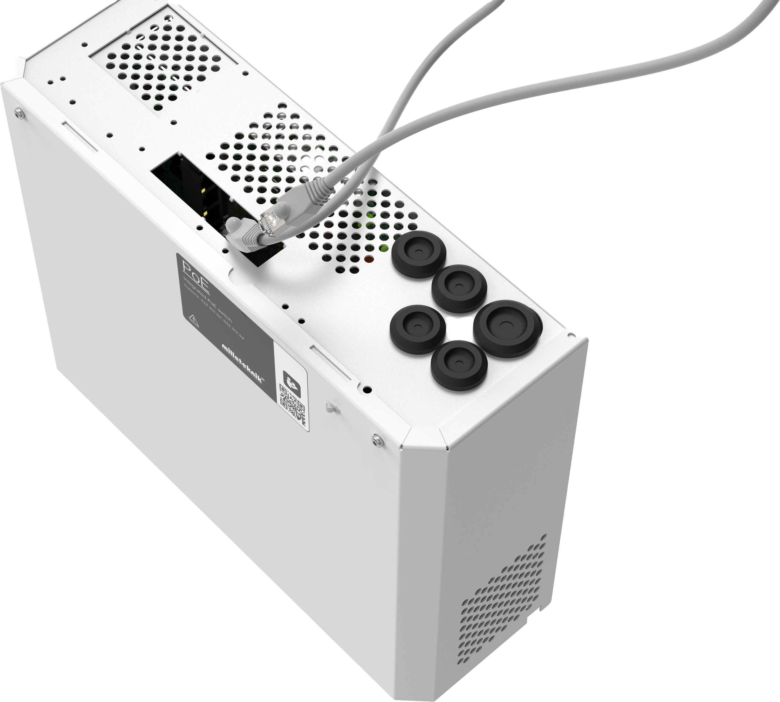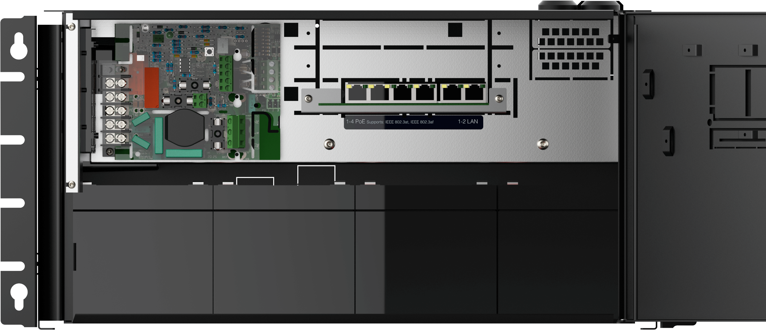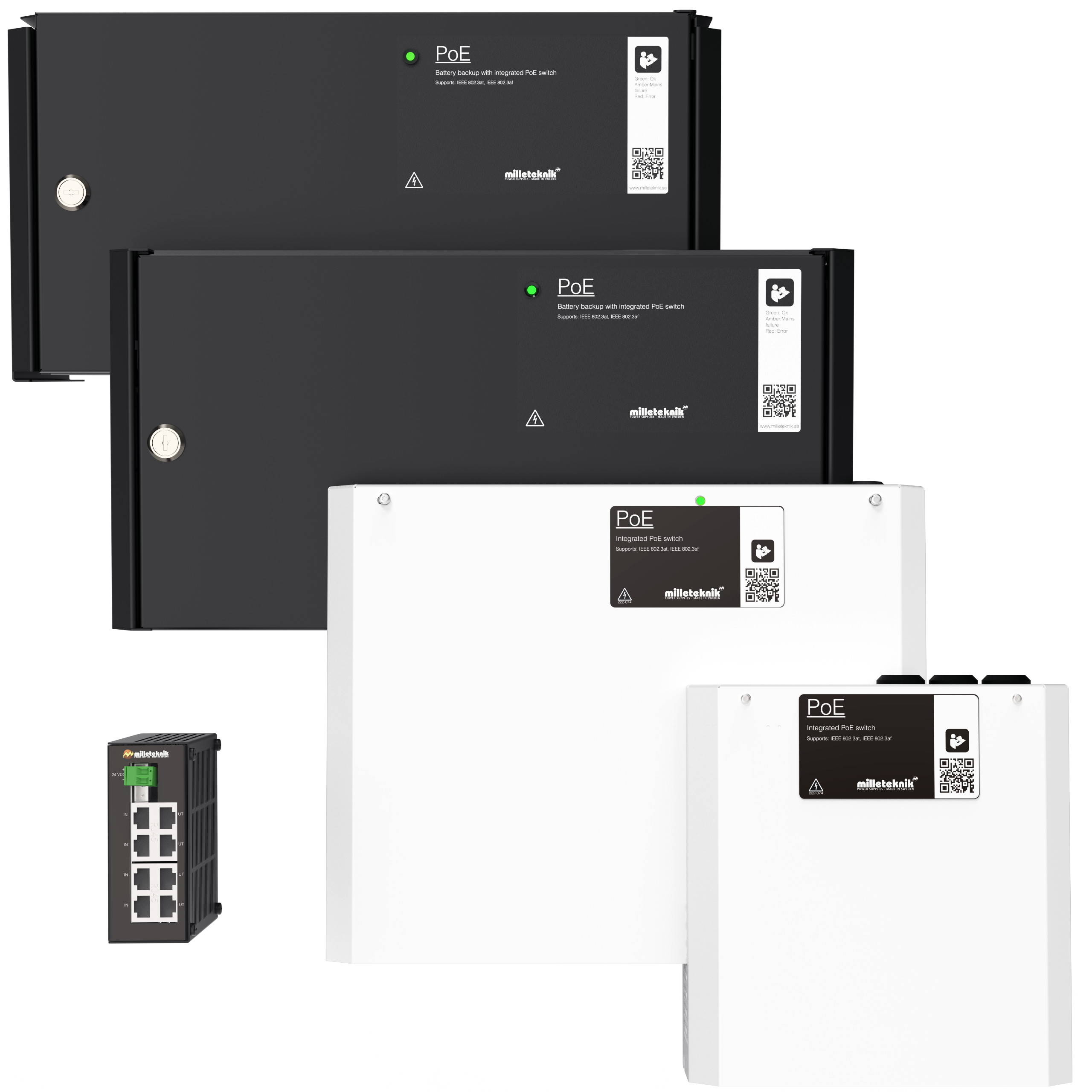 Enheten har en PoE switch med två LAN- och fyra PoE-portar och kan enkelt utökas med ytterligare en switchar till totalt åtta PoE-portar.