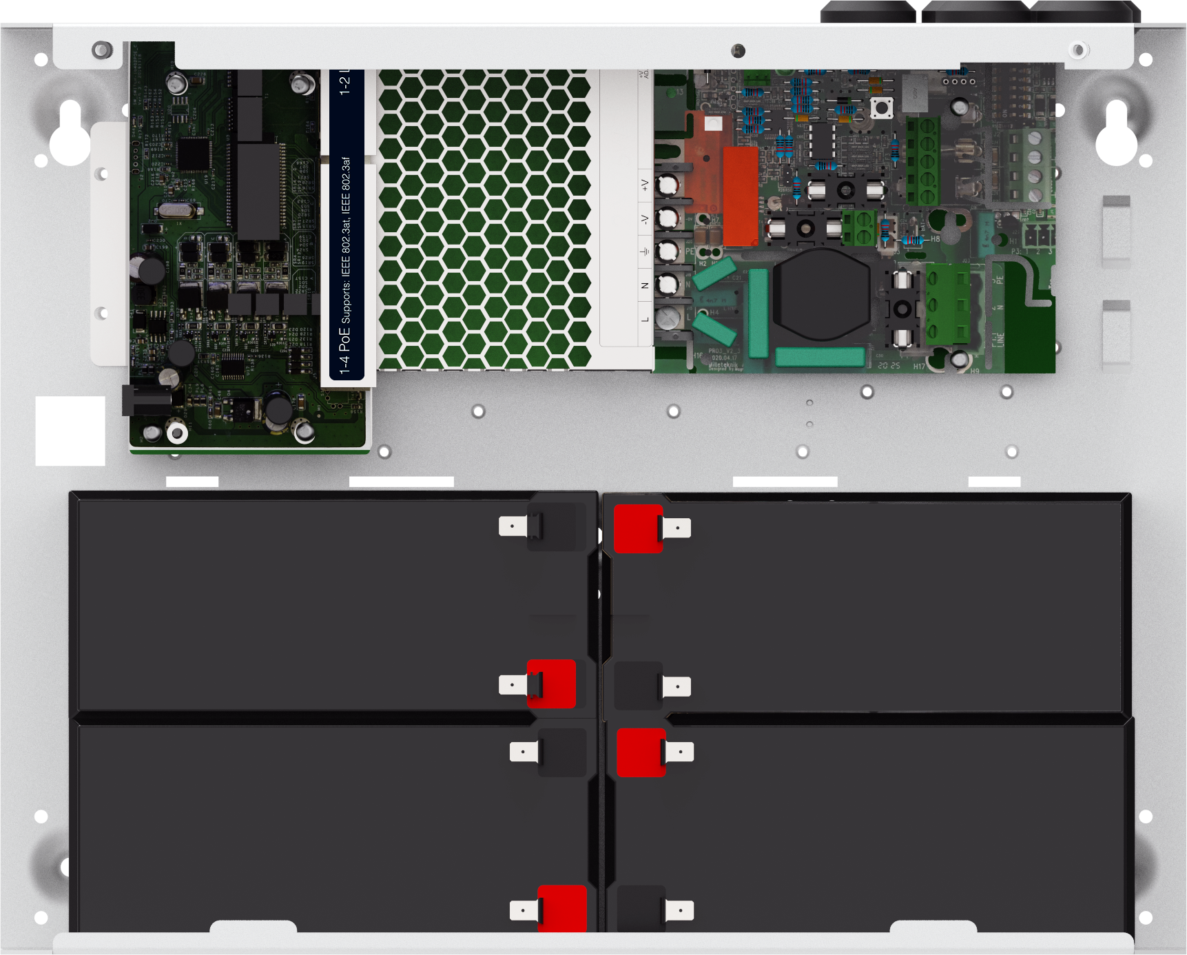 PoE FLX S används huvudsakligen i säkerhetssystem där en enkel och pålitlig strömförsörjning med batteribackup & PoE funktion behövs. Enheten har kontrollerad laddning vilket innebär att batterierna aldrig laddas med mer än 0,5A. Detta förhindrar att batterierna överladdas och förlänger deras livslängd betydligt.