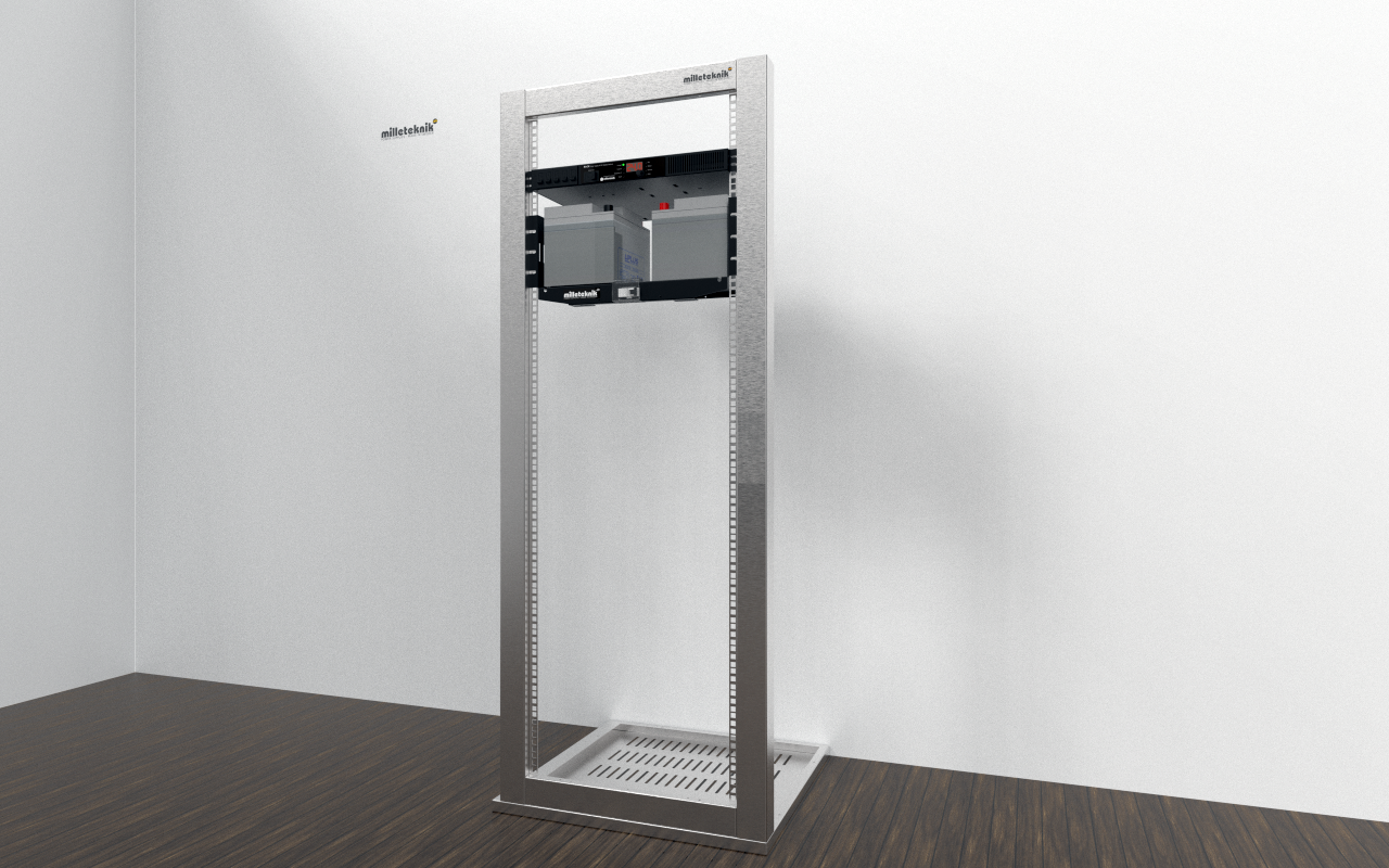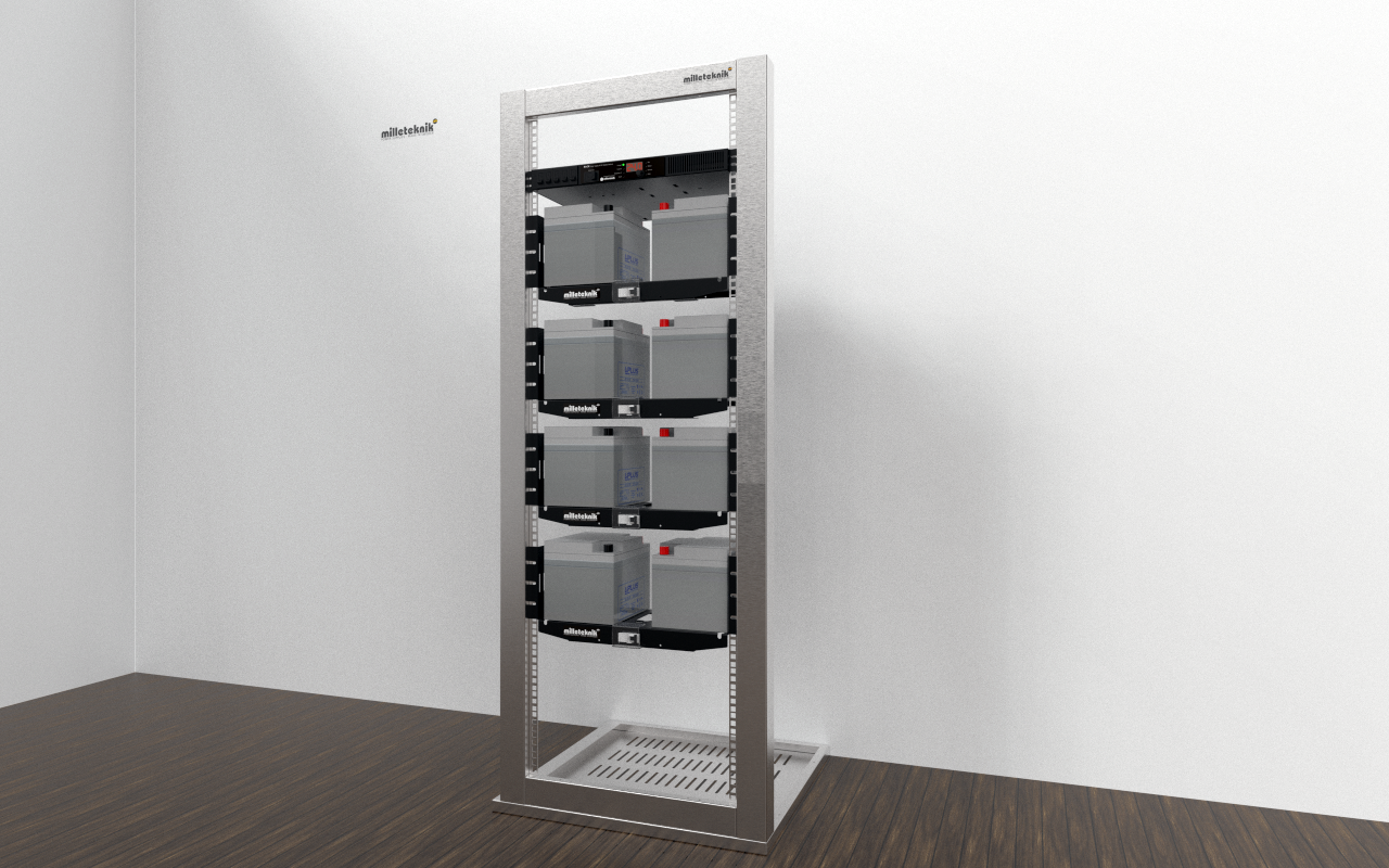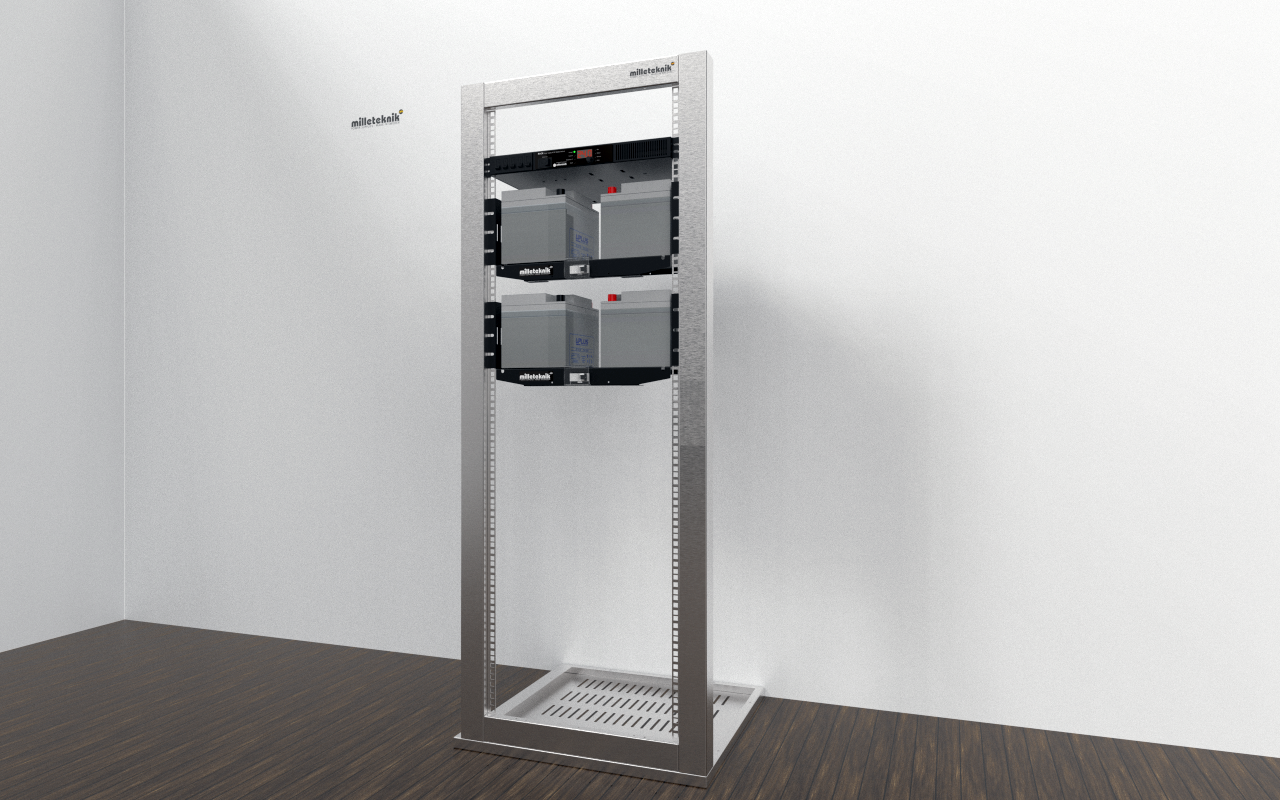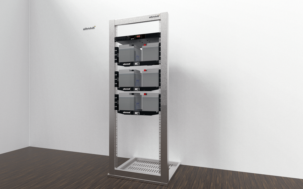 Levereras med färdigt kablage för anslutning till batterierna, automatsäkring emellan batterier samt färdig kabel för anslutning till batteribackupen. Hyllan är avsedd för 19” rackmontage.