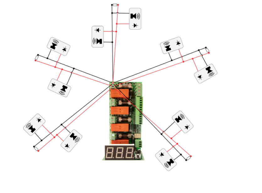 Övervakning av larmdon via inverterad spänning (24V) samt avsäkring av 1-4 utgångar. Fyra individuellt styrbara spänningsutgångar och/eller summastyrning och/eller utrymningsfunktion (prioriterad ingång). Konstant alternativt pulserande signal på utgång. Display och knapp gör att systemet kan kalibreras. Indikationer för vilken utgång och vad den larmar för, (avbrott eller kortslutning).