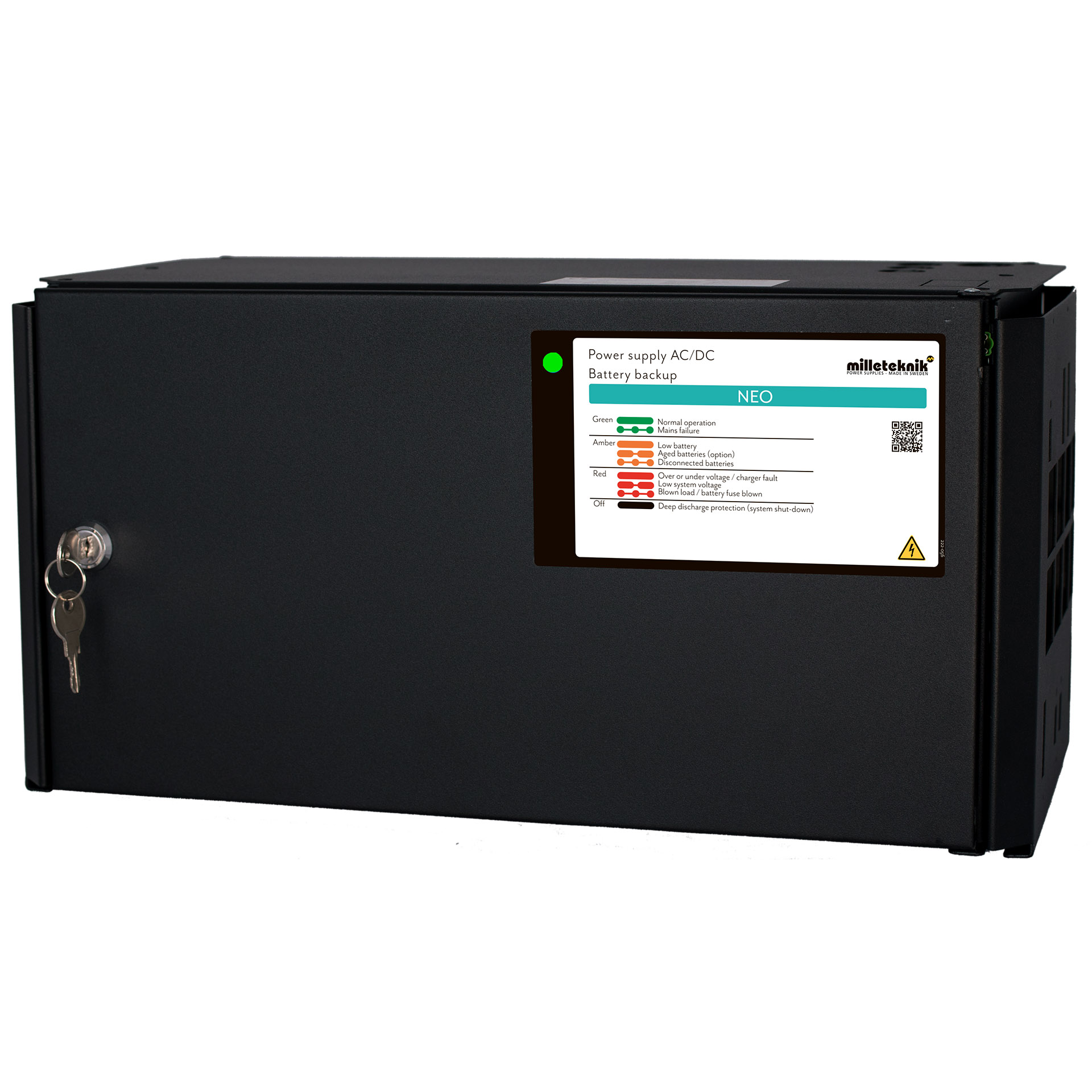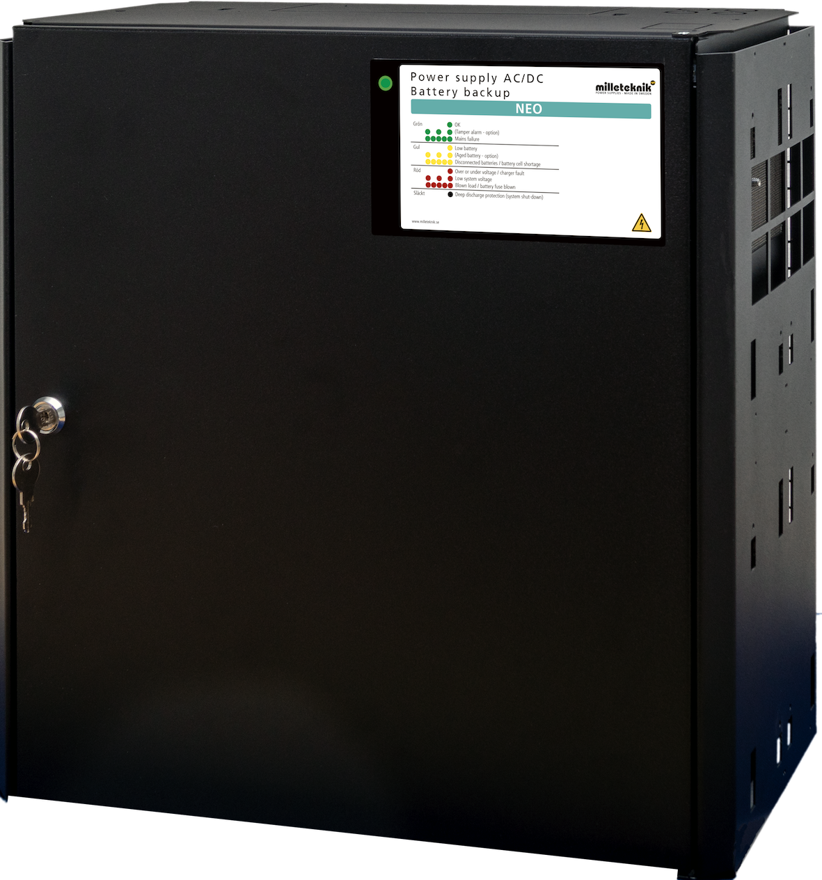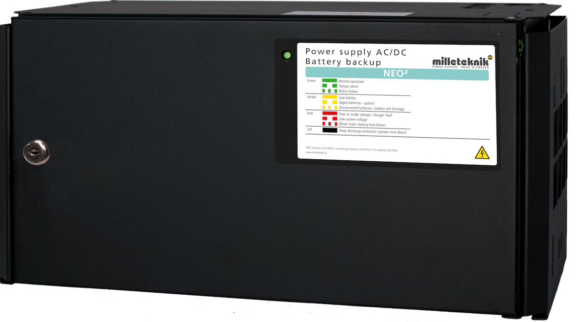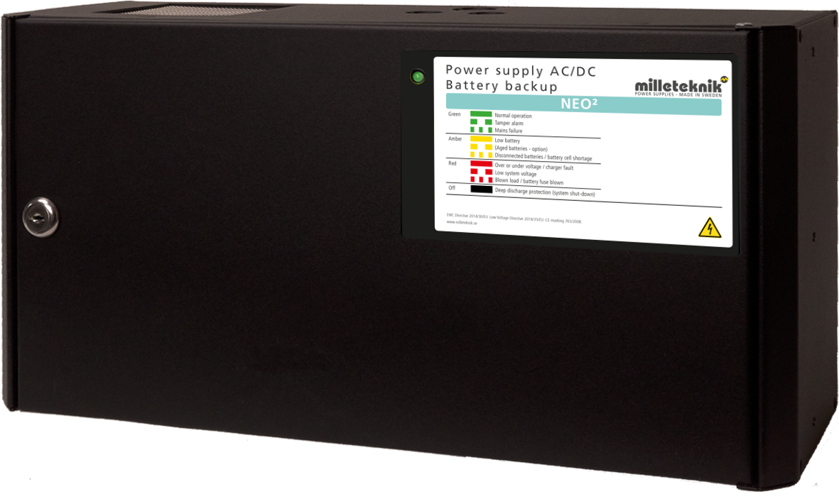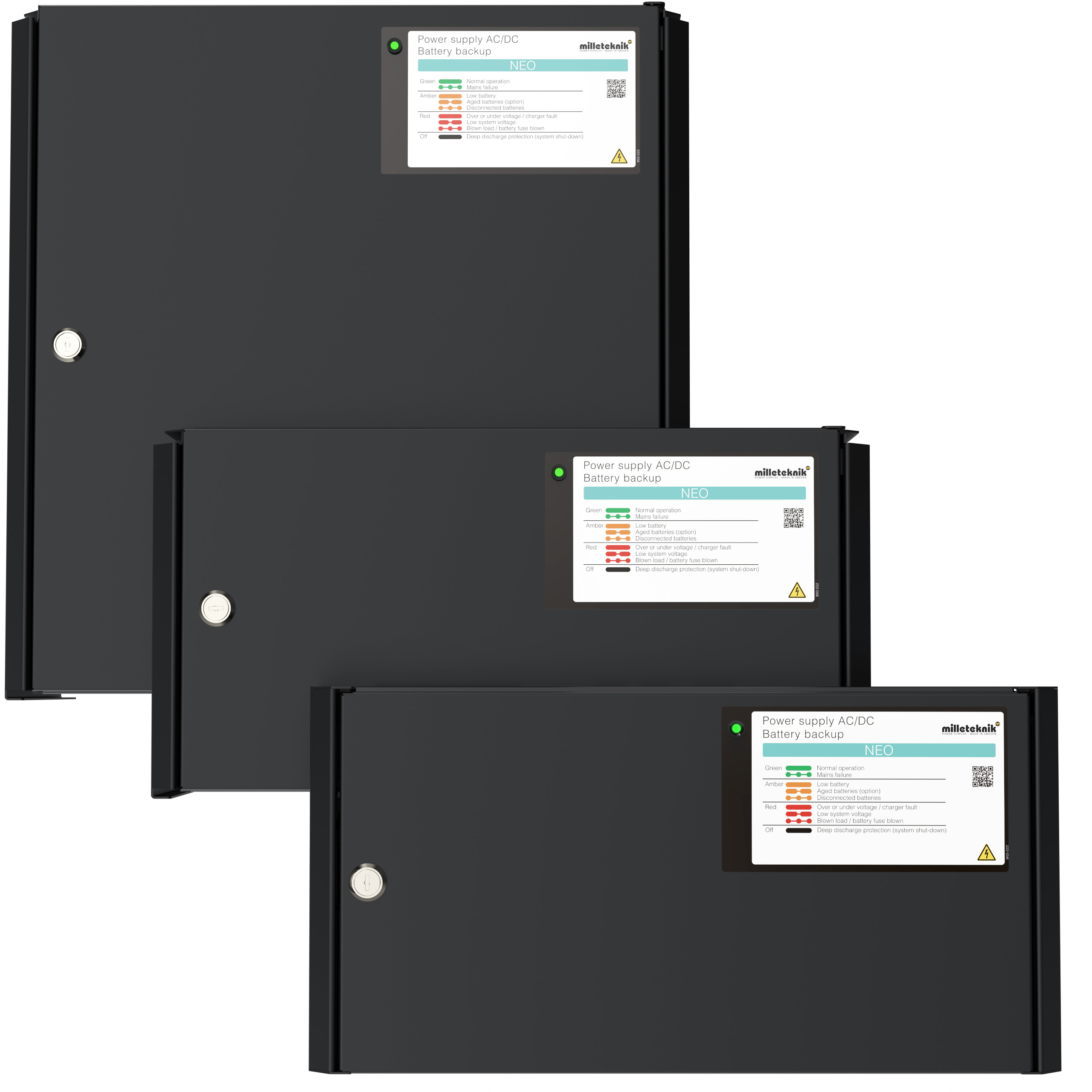 NEO-serien används i säkerhetsanläggningar där kraven är högre men där kommunikation till överordnat system ej krävs. Högre flexibilitet, fler larmfunktioner, längre reservdrifttider och högre laster är signum för batteribackuperna i NEO-serien.